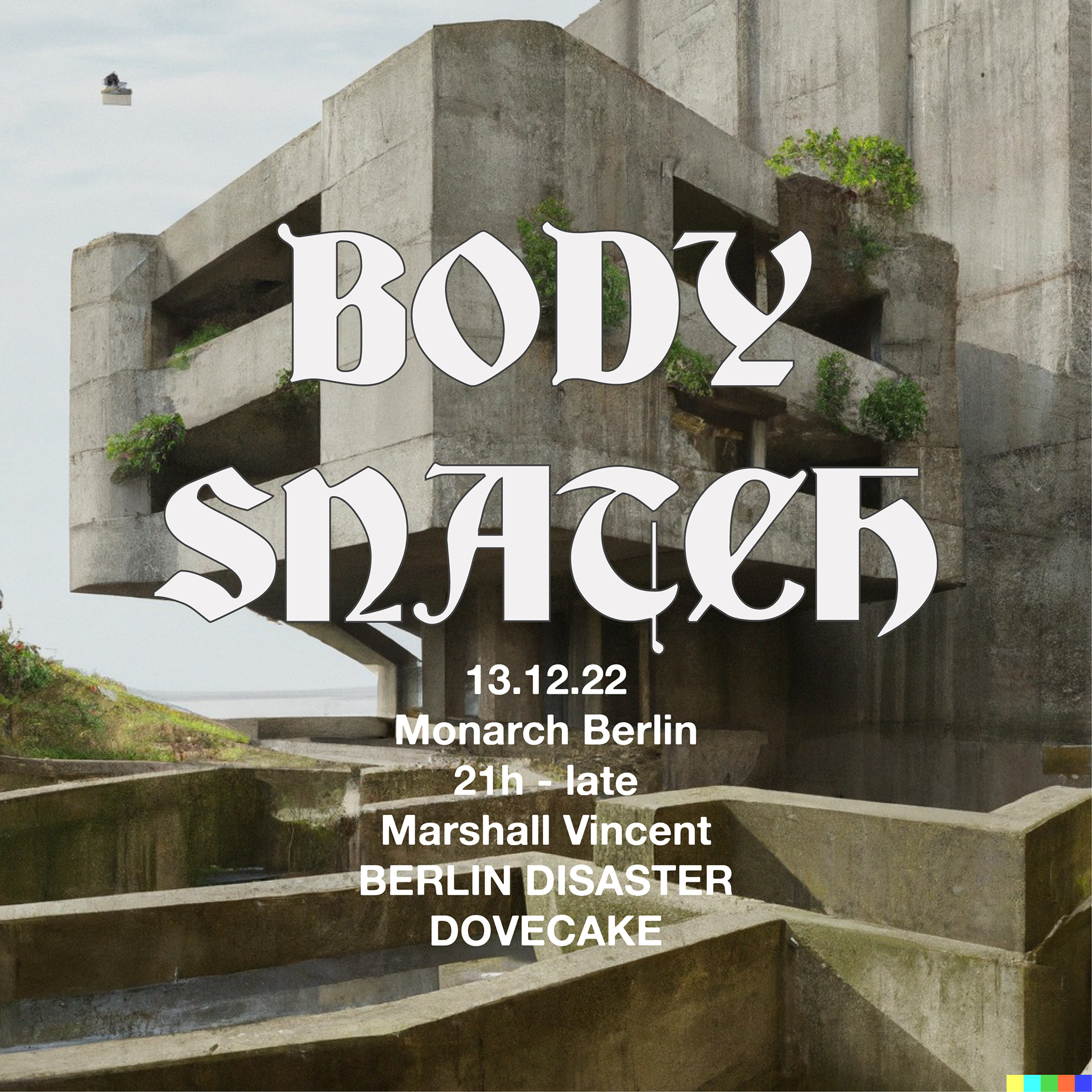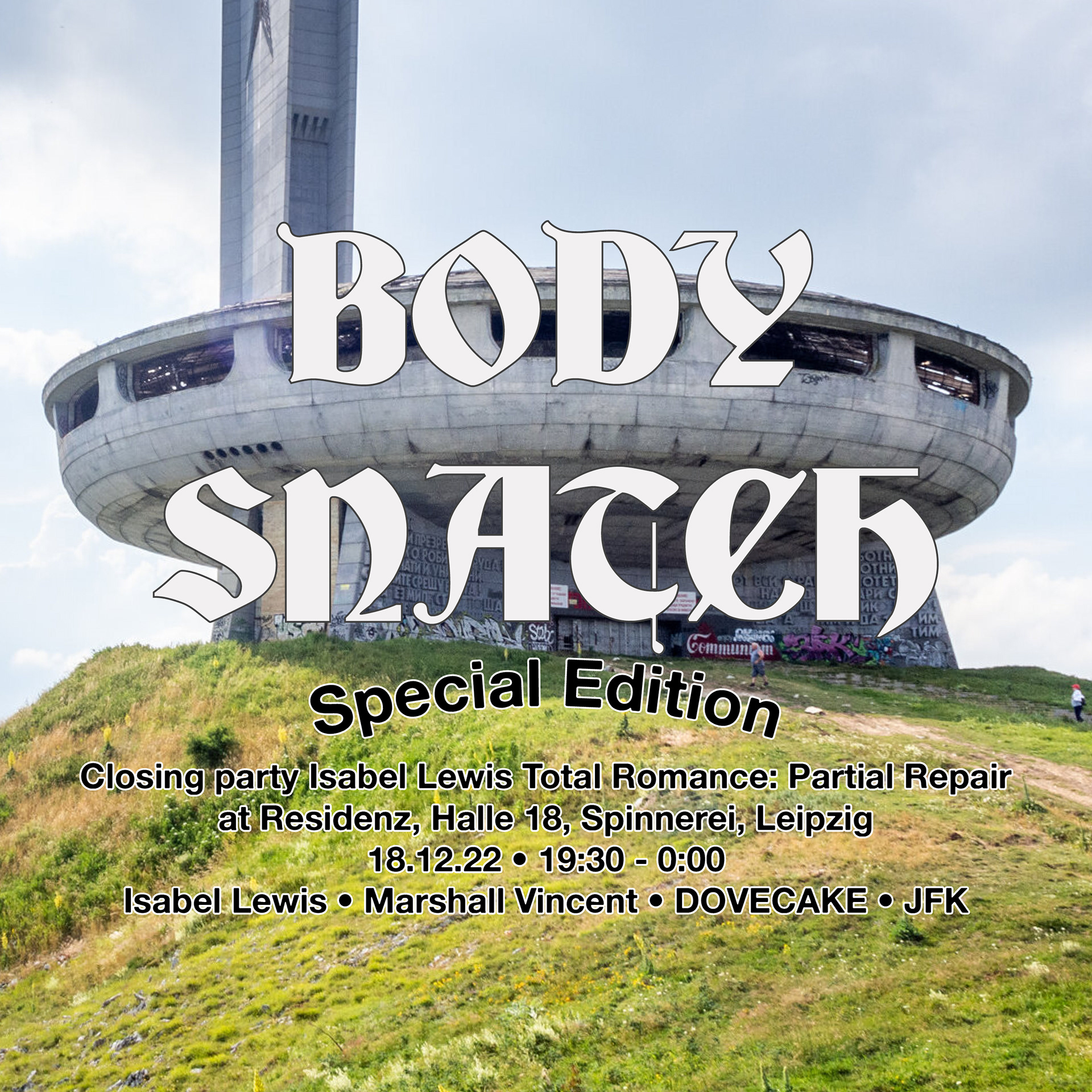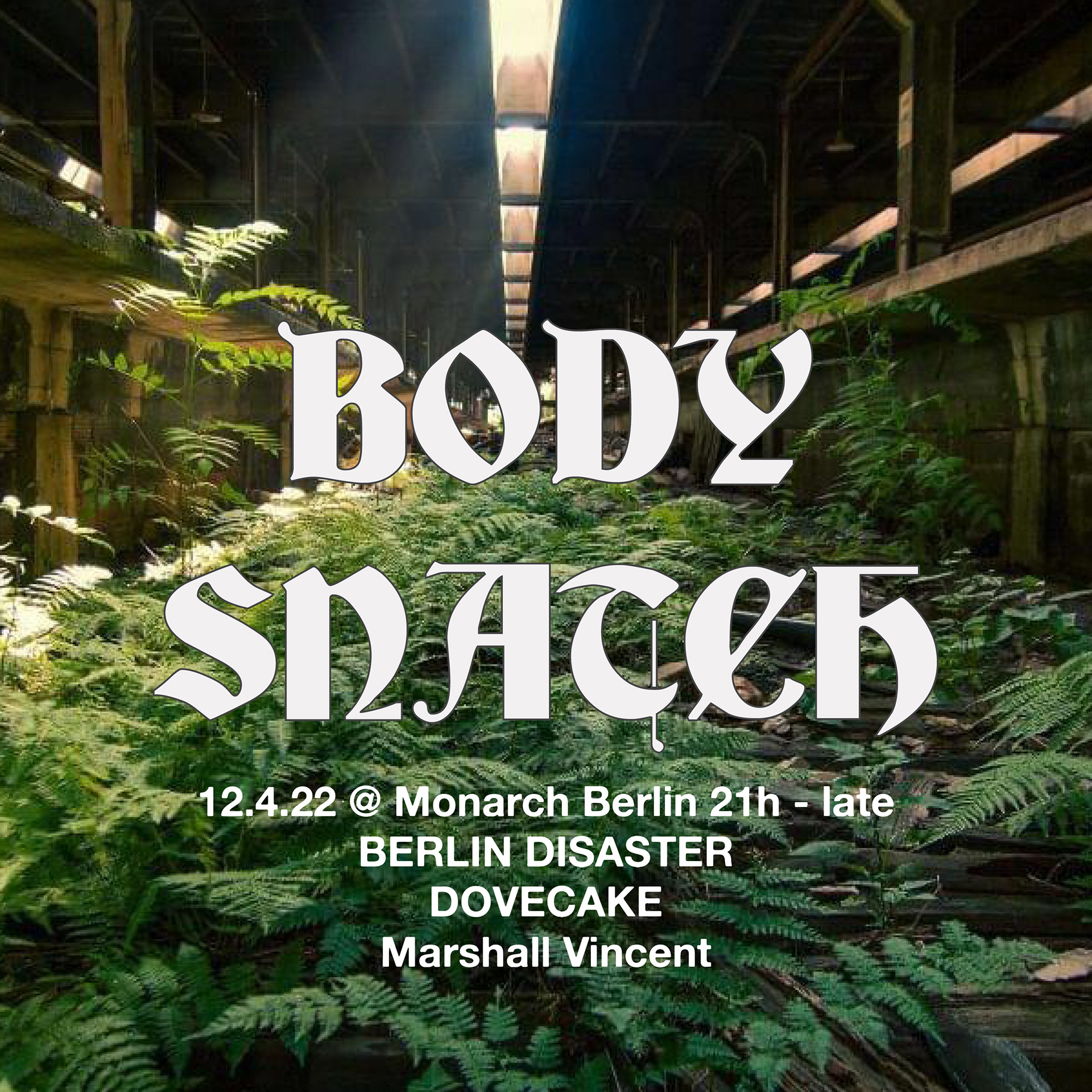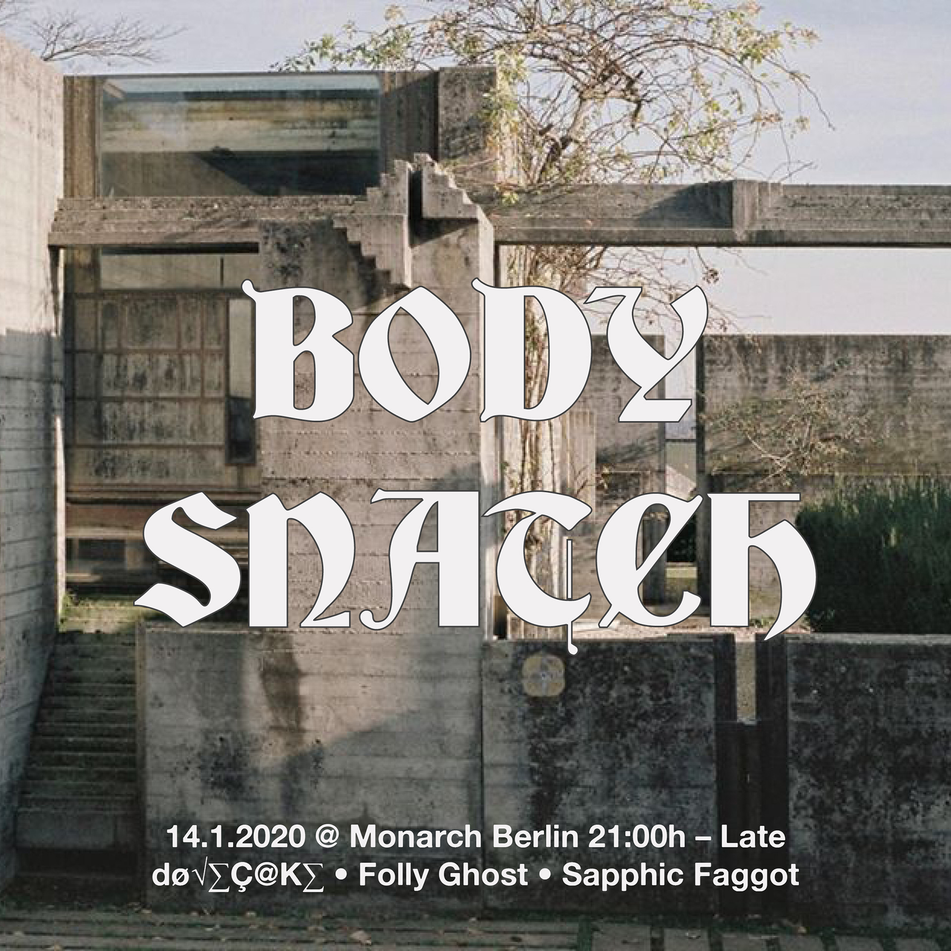 BODYSNATCH Berlin was an underground monthly club night founded in 2011 by Isabel Lewis, Justin Kennedy and Josep Maynou to deliver a dirty, sweaty, ass-shaking dance experience at Monarch, Kottbusser Tor, Berlin. The night eschewed the exclusionary and hierarchical door policies of other Berlin clubs with its open door policy and 2 euro cover fee, inviting experimental sets, spontaneous B2Bs, and new DJs to the decks, without ever fixing set times. Sets were never recorded, photo and video uncommon. The event series sunsetted in 2023 with occasional pop-ups in Berlin and worldwide.